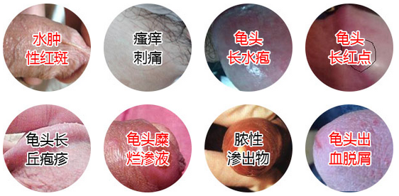 (4)急性淺表性龜頭炎的癥狀:初起局部潮紅,陰莖皮膚發(fā)紅、腫脹,龜頭有灼熱和瘙癢。翻開可見充血糜爛,有滲液甚至于出血。繼發(fā)感染后可見小潰瘍,和乳白色惡臭分泌物。